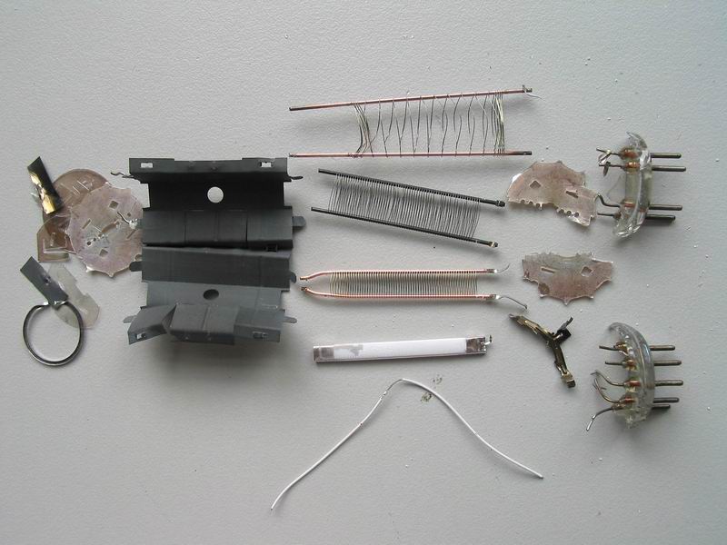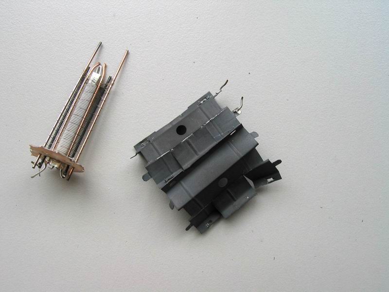 1:阳极;2:栅极,栅极里白色部分是栅极和阴极的绝缘层;3 就是阴极,这是个扁型金属管,灯丝就包在里面啦。