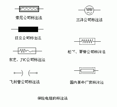 3. 保险电阻的常用规格标准。 (1) RN1/4W,10Ω保险电阻,色环为黑色,功率为1/4W;当8.5V直流电压加在保险电阻两端时,60秒以内电阻增大为初始值的50倍以上。 (2) RN1/4W,2.2Ω保险电阻,色环为红色,功率为1/4W;当3.5A电流通过时,2秒之内电阻增大为初始值的50倍以上。 (3) RN1/4W,1Ω保险电阻,色环为白色,功率为1/4W;当2.8A交流电流通过时,10秒内电阻增大为初始值的400倍以上。 4. 保险电阻在电路图中的画法。(见下图)